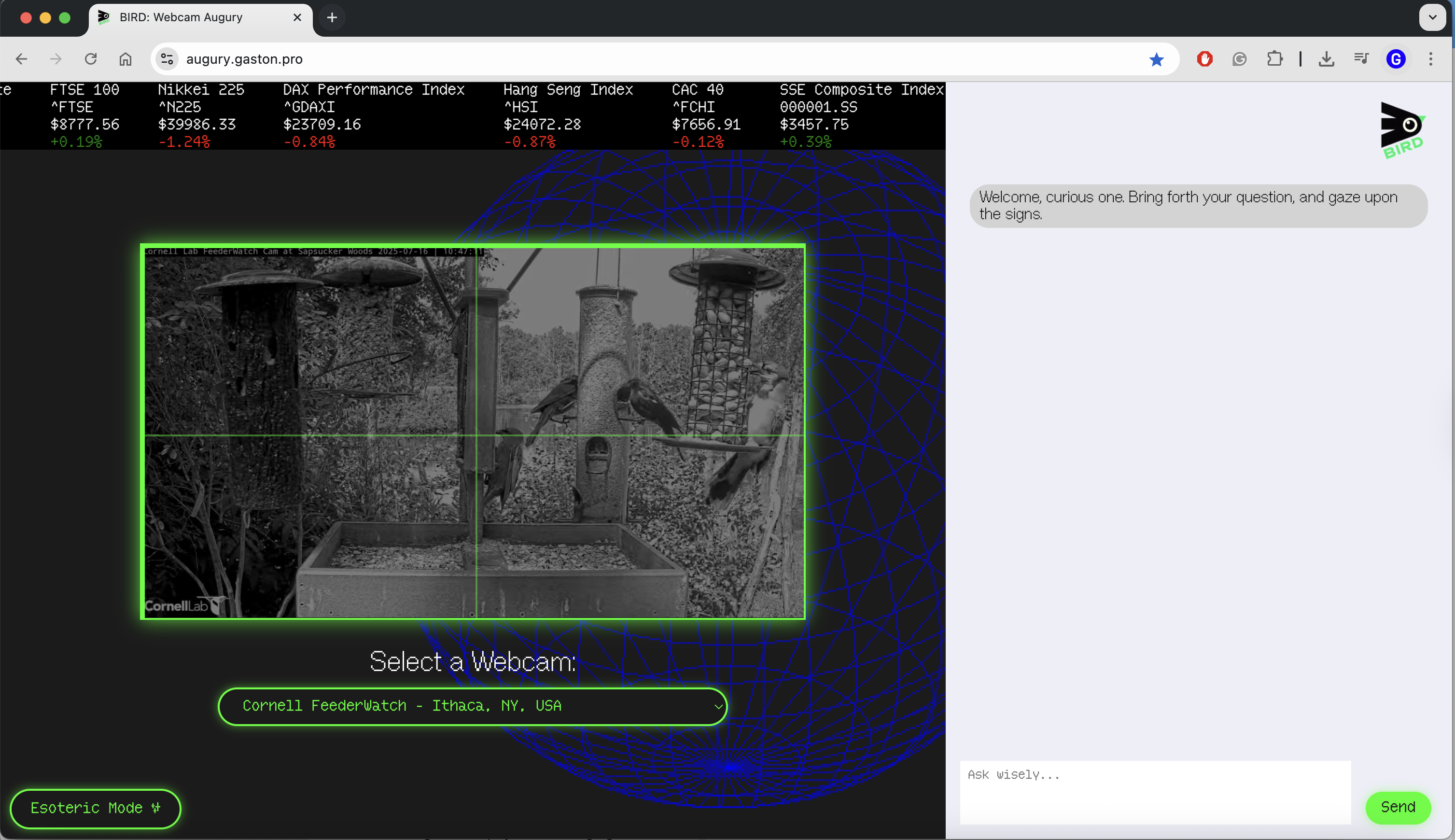 BIRD (Bird Informed Remote Divination) is a collaborative, chat-based augury experience (divination through observation of birds and sky). You are connected through webcams to birds across the world and are tasked to interpret the signs with an augur chatbot. Commissioned by and in collaboration with AIXDesign.